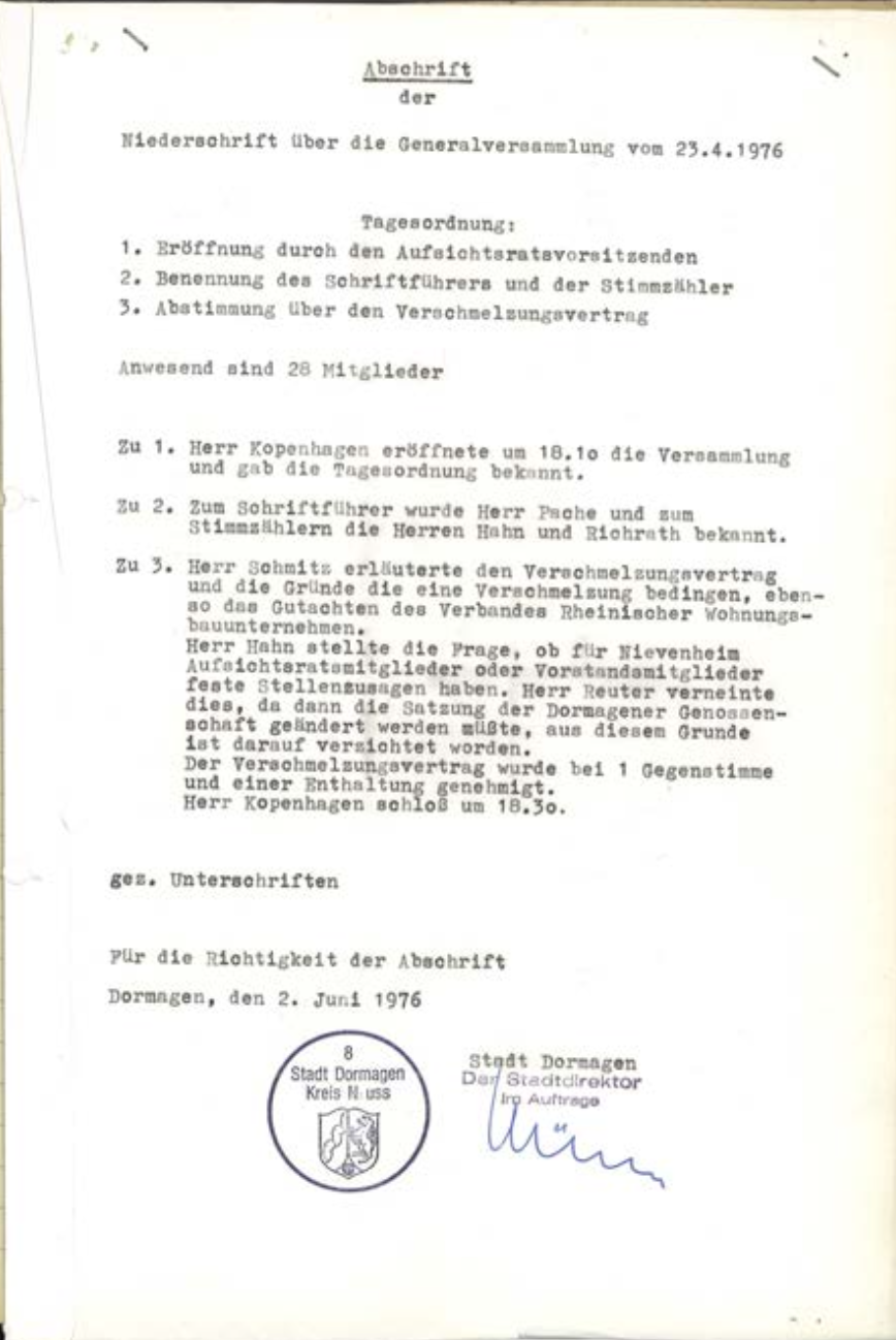 Am 19. Januar 1976 unterzeichneten beide Genossenschaften den Fusionsvertrag. Rund 240 Mitglieder wurden Teil der Baugenossenschaft Dormagen und circa 20 Objekte mit 80 Wohnungen gingen in den Besitz der Dormagener Genossenschaft über. Die Fusion trat am 1. Juli 1976 in Kraft.